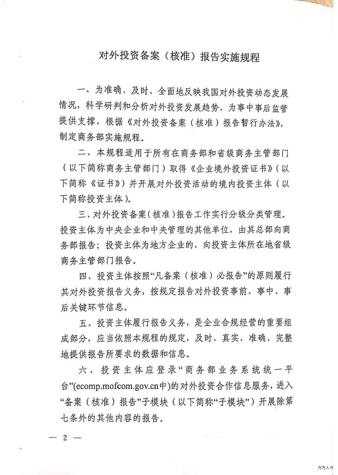为贯彻落实《对外投资备案(核准)报告暂行办法》(商合发﹝2018﹞24号),加强对外投资事中事后监管,推动对外投资健康有序发展,商务部制定了《对外投资备案(核准)报告实施规程》(以下简称规程),现予以印发,自2019年7月1日起施行。