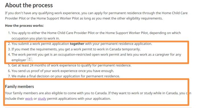 联邦政府的Home Support Worker Pilot项目允许在加拿大连续工作2年的Home Support Worker申请永居,对于加拿大境外申请者可以同时申请工作签证和永居,工作满2年后可审核永居资质,工作签证期间可以带配偶和孩子。相关政策信息参考下图(截取自加拿大移民局官网)。