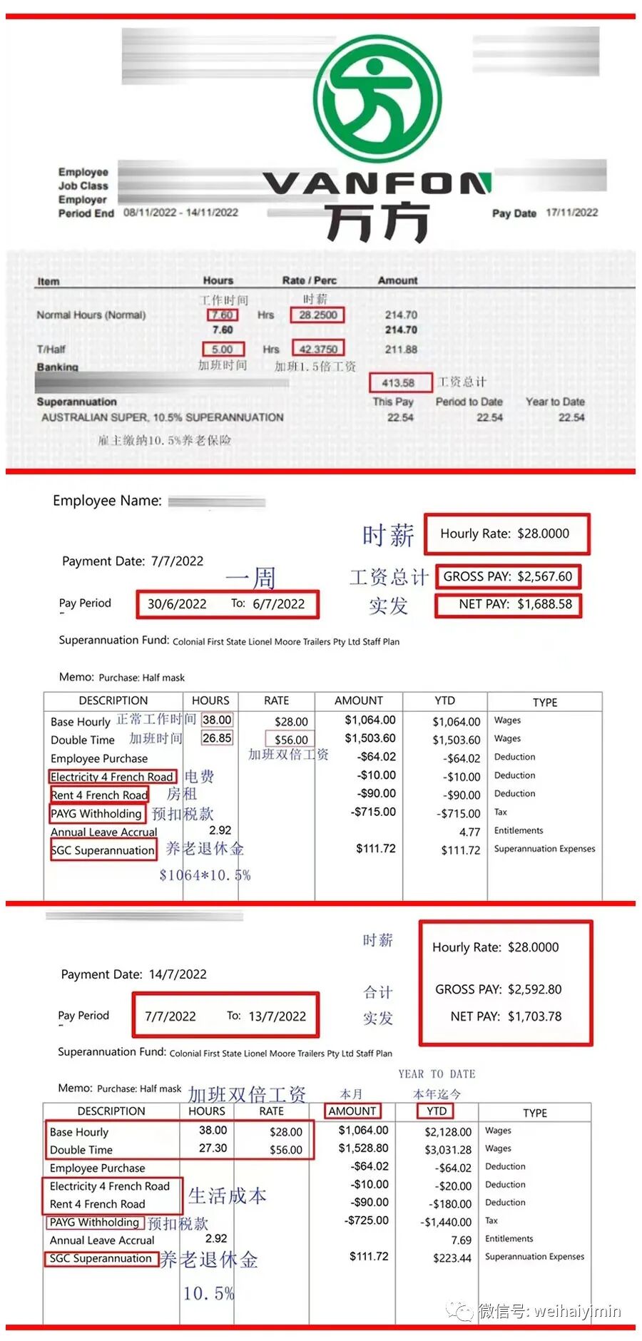 澳洲工资方面,今年调整了最低收入标准,年收入由53900澳币提升到60000澳币,加班1.5倍没有变。刚到达澳洲的朋友,工资并不如老工人多,但美好生活都是点滴积累起来的,下面为大家展示几位工友的薪资单。(工资单币种为澳币,汇率4.7左右)