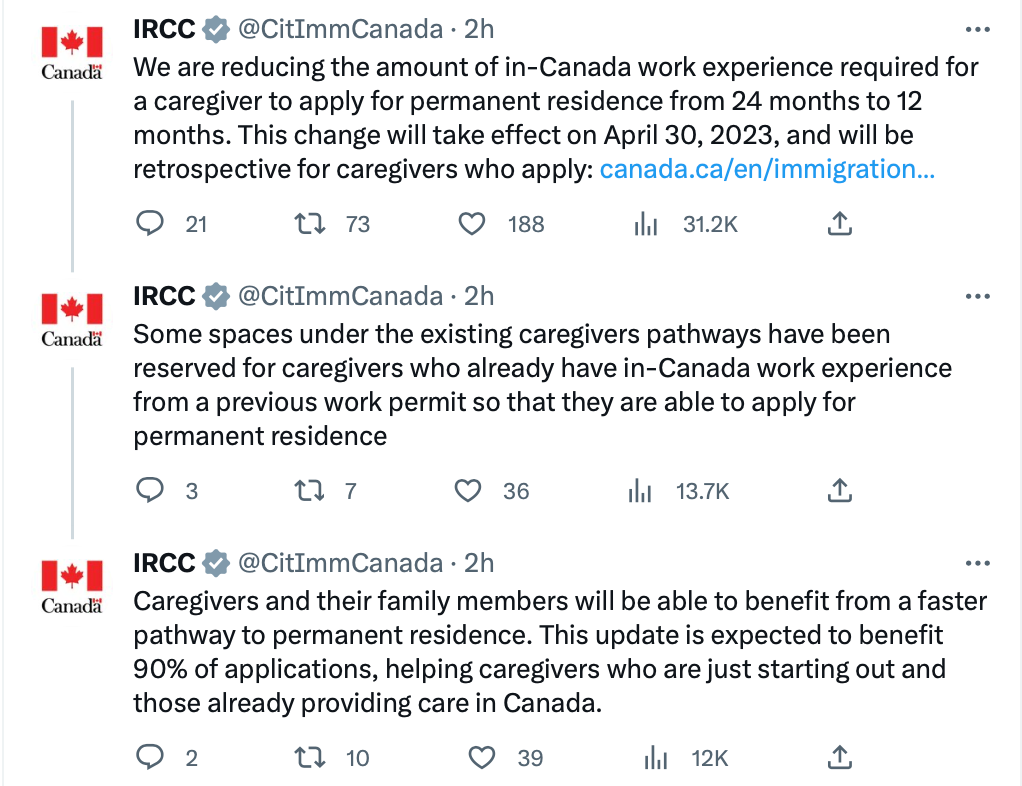 加拿大移民部发布全新政策修改,这一次直接将加拿大联邦看护移民项目要求的加拿大境内相关工作经验减少了50%!原本,申请人在过去3年内,必须累计有2年的加拿大境内相关工作经验,从2023年4月30日开始,申请人仅需1年加拿大境内相关工作经验,便可以申请枫叶卡!这意味着,此移民门槛降低,时长减少一半!