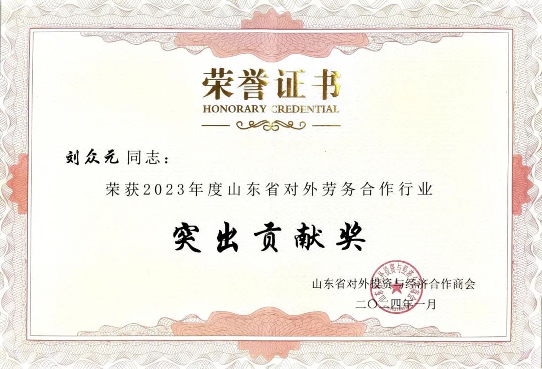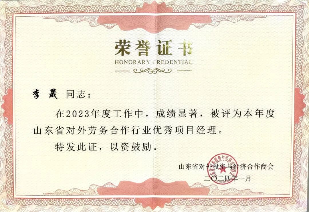 3月12日,山东省对外投资与经济合作商会五届三次理事会在济南召开,我司荣获2023年度山东省对外劳务合作行业先进单位奖,我司员工刘众元获得2023年度山东省对外劳务合作行业突出贡献奖,李晟获评2023年度山东省对外劳务合作行业优秀项目经理。