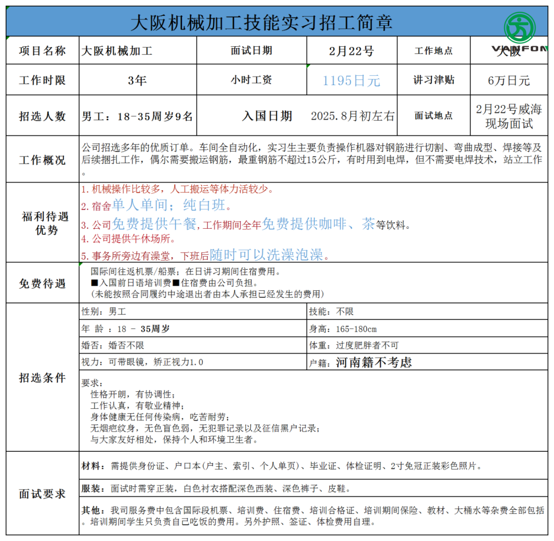 ✅招大阪机械加工男生9人(河南籍不可),年龄18-35周岁,婚否不限。如面试落选报销往返路费!